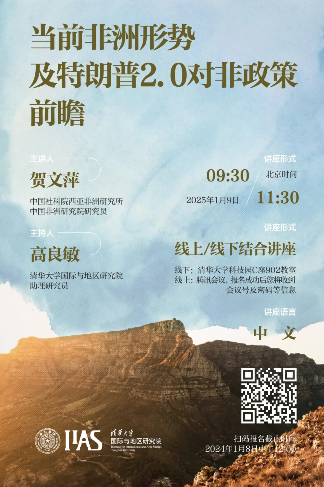 On January 9, 2025, from 9:30 am to 11:30, Center for Sub-Saharan African Studies of the Institute for International and Area Studies (IIAS) at Tsinghua University hosted the fifth lecture of the 2024-2025 autumn semester “Current African Situation and Prospects of Trump 2.0 Policies Towards Africa”. The lecture was held both online and offline and was delivered by Researcher He Wenping from ...