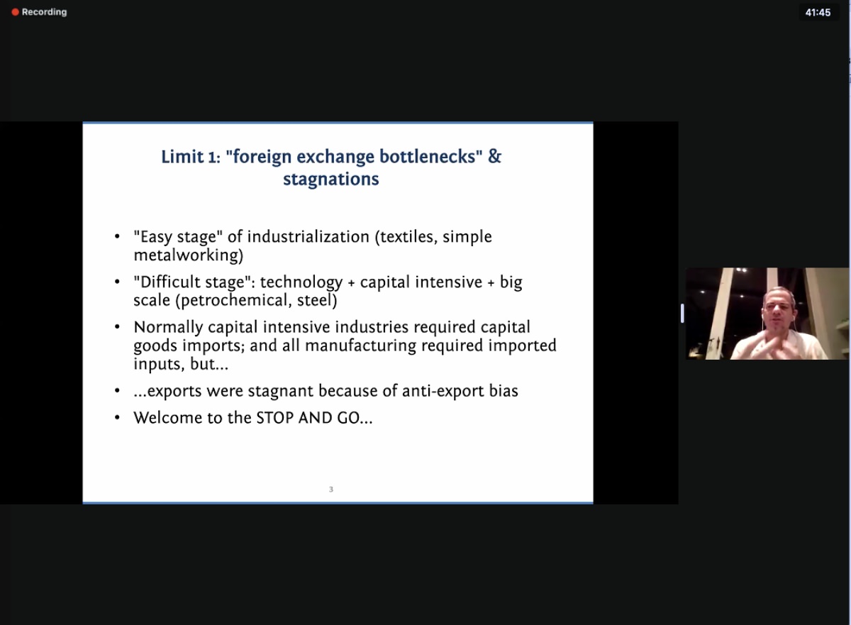 At the beginning, Professor Llach recalled the sixth lecture about the crisis and internal reform of import substitution industrialization and two limits came along with it: “foreign exchange bottlenecks” and export stagnation; the phenomenon of high inflation. On top of that, he introduced the theme of this lecture, i.e. the great economic instability in Latin America since 1970. During this period, some countries in Latin America began to adopt new development strategies, such as the production of industrial finished products with more international comparative advantages for export, and the expansion of trade openness; whereas some smaller countries reverted to the mode of primary product export. After the first oil crisis, soaring oil prices pushed up inflation in various countries, and the petrodollar system was gradually formed, which was denominated and settled in US dollars. Countries introduced various measures to cope with inflationary pressure,. For example, Argentina began to implement the floating exchange rate system named “Tablita” in 1978, in which the range of exchange rate changes was determined and announced in advance to lower people’s inflation expectations. Tightening monetary policies led to tighter financing environment and prominent debt vulnerability and a debt crisis ensued when a large number of international borrowing debts exceeded the repayment capacity of debtor countries. He then explained how high inflation in Latin America turned into hyperinflation, fueled by governments printing money in response to fiscal crises and falling currencies due to imbalances in the balance of payments. Citing the Cagan Effect and the Olivera-Tanzi Effect, Professor Llach pointed out that Latin America was trapped in a situation where inflation bred inflation. In the 1980s and 1990s, Argentina and Brazil, for example, introduced new currencies, Austral and Cruzado respectively, and implemented the currency board system and the Real Plan. At the same time, Latin American countries successively introduced various measures and reforms to stabilize economic development. Finally, in the 1990s, the Latin American economy was brought into a relatively stable stage of development.