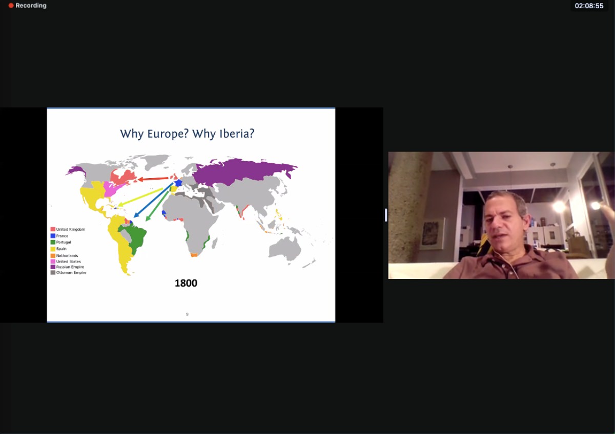 At the beginning of the lecture, Professor Llach reviewed the four major stages of economic history and development in Latin America and the important exogenous impacts at each stage. Firstly, he mentioned that before the “Columbian Exchange”, Latin America’s economic and social development was mainly concentrated in Mesoamerican and the Andean region with reliance on agriculture. There was a lack of horses for transportation and no use of metal to make production tools. Professor Llach then cited The Cambridge History of Latin America authored by Elinor Melville to explain the colonization of Latin America by European settlers, who plundered tobacco, sugar, coffee, gold, silver, gems and other resources from Latin America and the Caribbean in the 1500s. Therefore, in the colonial period, Latin America witnessed the shaping of the mining economies represented by Mexico, Peru and Bolivia, the plantation economies represented by Caribbean countries, Brazil and parts of Colombia, the population economies represented by Mexico and Peru, and the agricultural economies represented by Argentina, Uruguay and Chile. He also mentioned that European colonization brought Latin America into the global economy either passively or actively, leading to the emergence of new species, new immigrants and new labor management systems in the region.