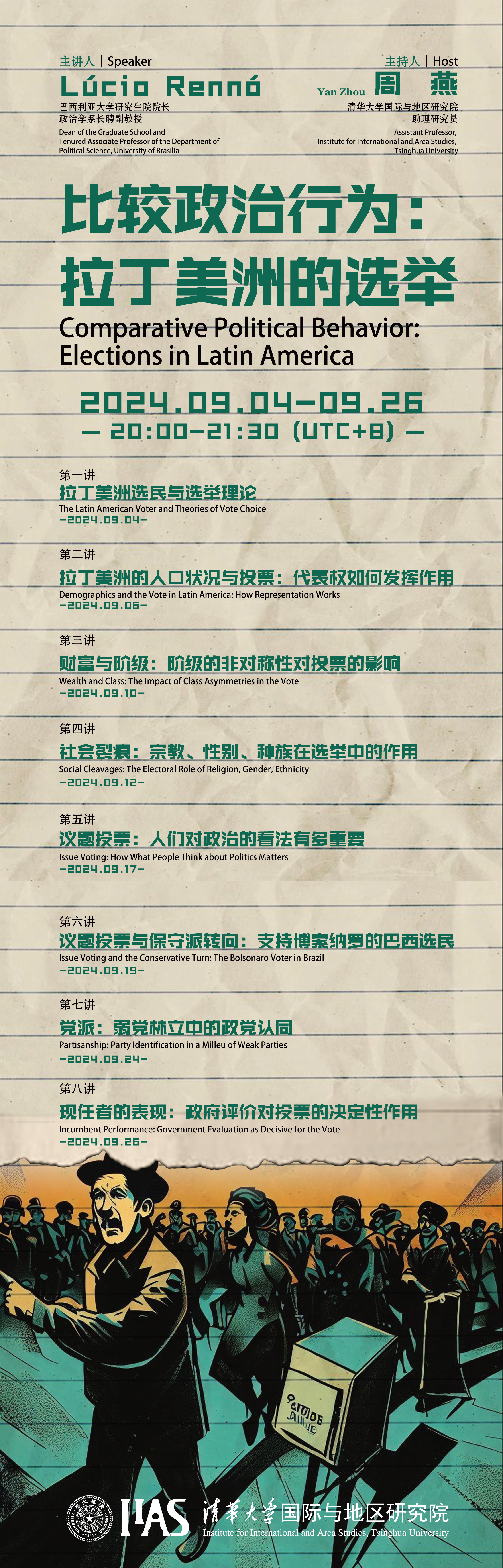 From September 4th to September 26th, 2024, the Institute for International and Area Studies (hereinafter referred to as IIAS) at Tsinghua University invited Lúcio Rennó, Dean of the Graduate School and Tenured Associate Professor of Political Science at the University of Brasilia, to give a series of lectures on the topic “Comparative Political Behavior: Elections in Latin America”. The lectures consisted of eight sessions, with the themes being “Latin American Voters and Electoral Theory”, “Latin America's Demographic Situation and Voting: How Representation work”?, ‘Wealth and class: the impact of class asymmetry on voting’? ,‘Social cleavages: the role of religion, gender and race in elections’?, ‘Issue voting: how important is people's perception of politics’? ,‘Issue voting and the conservative shift: Brazilian voters supporting Bolsonaro’?, ‘Parties: political party identity in a weak party system’? and ‘Incumbent performance: the decisive role of government evaluation in voting’. The lecture series was hosted by Zhou Yan, Assistant Professor at IIAS. More than 100 people attended, including teachers and students from IIAS, as well as scholars and students from universities at home and abroad.