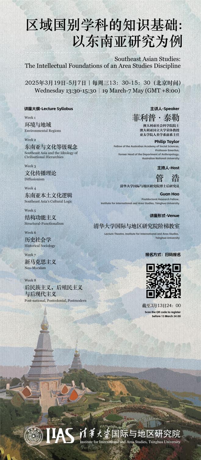 • On the afternoon of April 16, 2025, the Institute for International and Area Studies of Tsinghua University invited Professor Philip Taylor, a member of the Australian Academy of Social Sciences, Emeritus Professor of the Australian National University, and former Head of the Department of Anthropology of the Asia-Pacific Institute, to give the fifth talk on “Southeast Asia’s Cultural Logic” of the lecture series on “Southeast Asian Studies: The Intellectual Foundations of an Area Studies Discipline”. The lecture was hosted by Guan Hao, a post-doctoral researcher in IIAS. Dozens of students and faculty members from domestic and foreign universities as well as professionals who are interested in the topic attended, both offline and online.