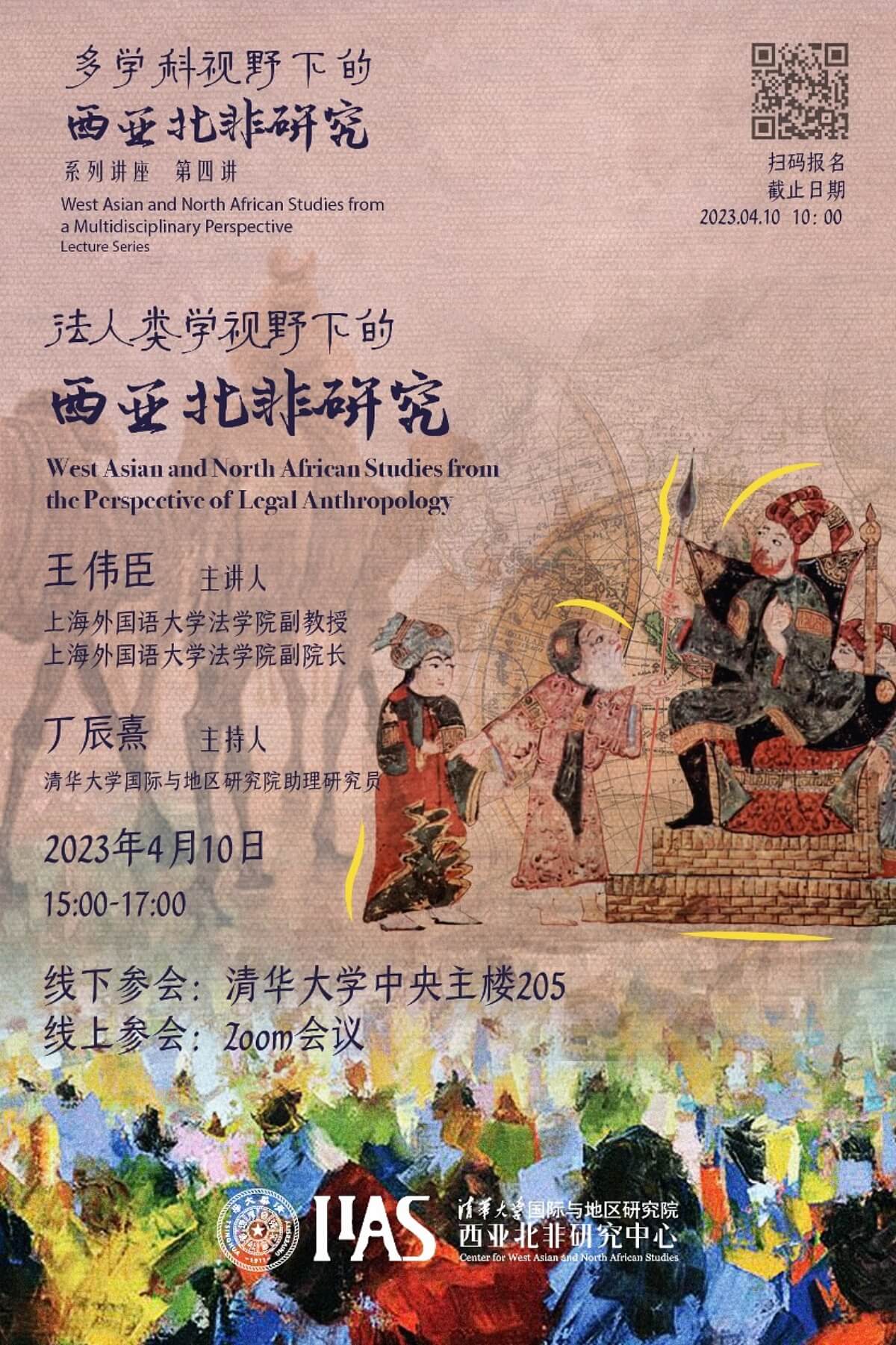• On the afternoon of April 10, 2023, the Center for West Asian and North African Studies at the Institute for International and Area Studies (IIAS) of Tsinghua University hosted the fourth lecture of the “Western Asian and North African Studies from a Multidisciplinary Perspective” series for the 2022-2023 spring semester both online and offline. Themed “West Asian and North African Studies from the Perspective of Legal Anthropology,” this lecture was delivered by Wang Weichen, Vice Dean and Associate Professor of the School of Law at Shanghai International Studies University, and presided over by Ding Chenxi, Assistant Professor at the IIAS. Over 160 scholars and students from various universities and those interested in the topic attended the lecture.