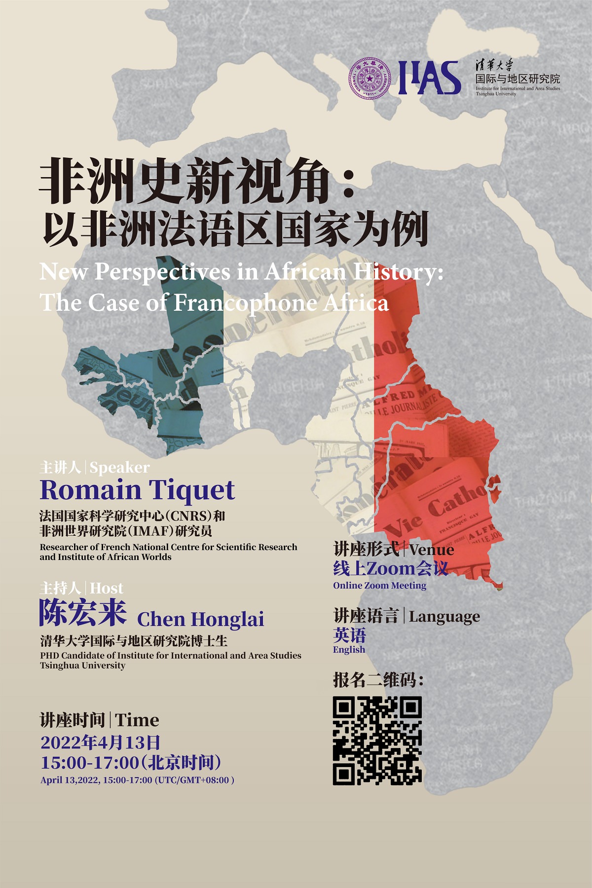 On April 13, 2022, the Institute for International and Area Studies (IIAS) of Tsinghua University hosted the second Sub-Saharan African studies lecture of the spring semester 2022 online. Entitled “New Perspectives in African History: The Case of Francophone Africa”, the lecture was delivered by Dr. Romain Tiquet, a researcher at CNRS and IMAF, and it presided over by Chen Honglai, a Ph.D candidate at the IIAS. Students from the IIAS, and scholars and students from universities at home and abroad joined the online lecture.