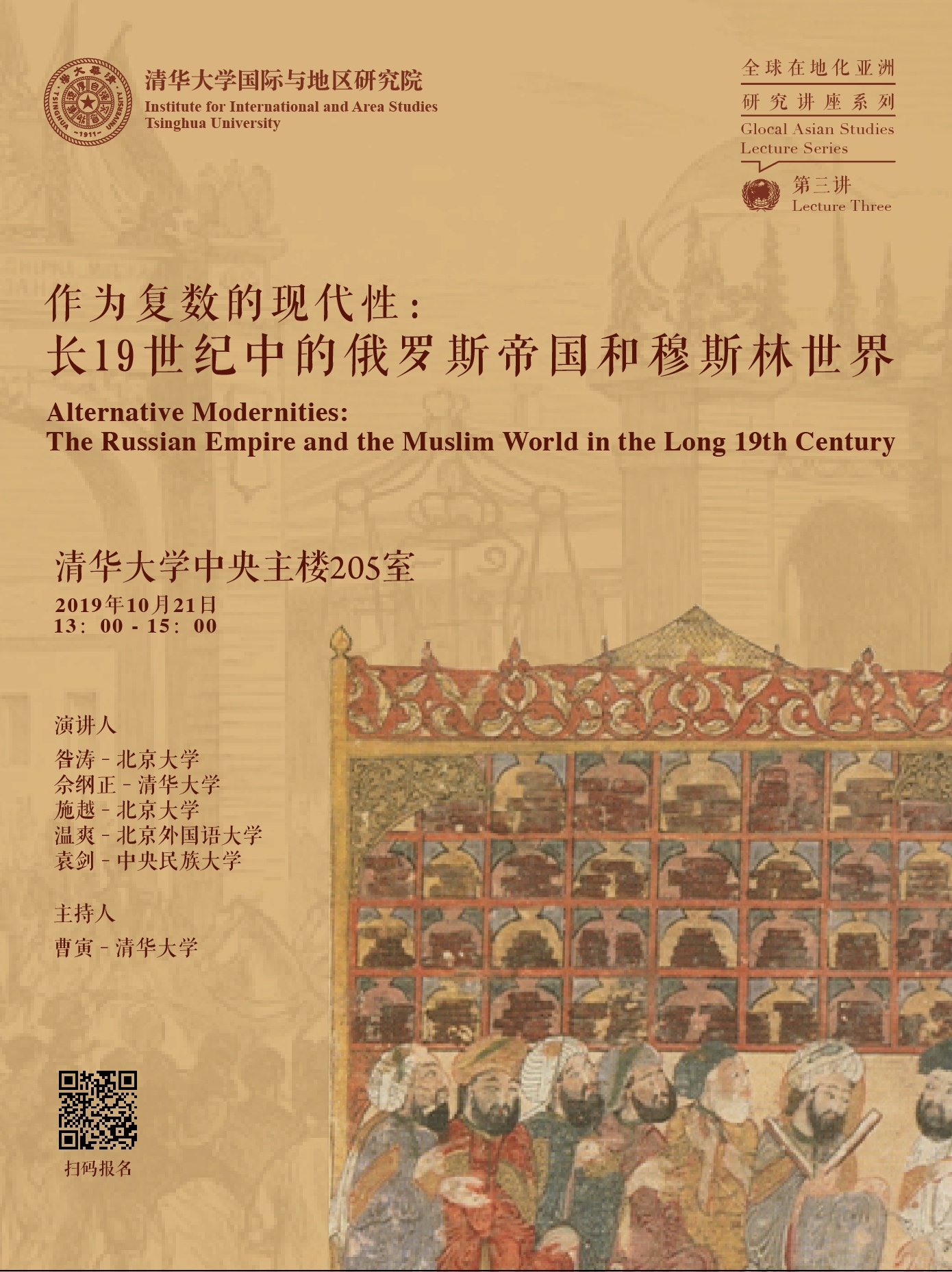 On October 21, 2019, Prof. Zan Tao from Peking University, Prof. She Gangzheng from Tsinghua University, Prof. Shi Yue from Peking University, Prof. Wen Shuang from Beijing Foreign Studies University and Prof. Yuan Jian from Central University for Nationalities as the presenters, and Prof. Cao Yin, Associate Professor from Tsinghua University as the host , brought the lecture of “Alternative Modernities: The Russian Empire and the Muslim World in the Long 19th Century” at the Institute of International and Area Studies (IIAS) of Tsinghua University.