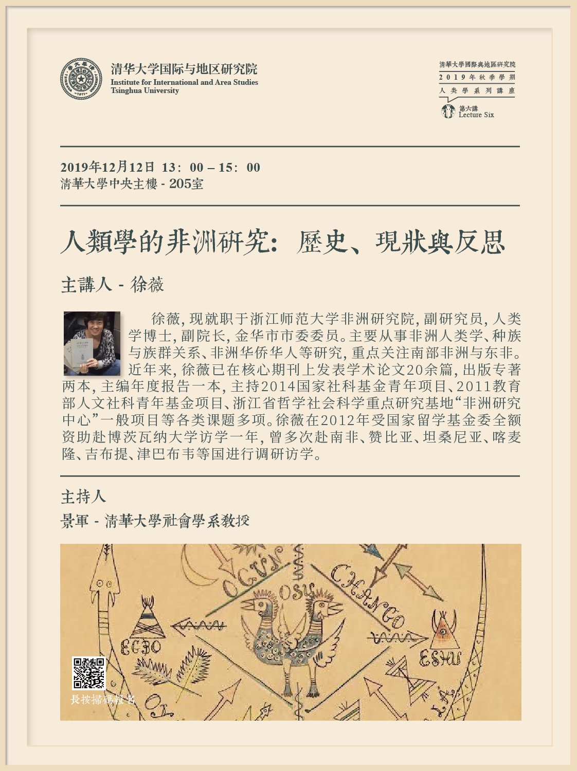 On December 12, 2019, the 6th session of IIAS Anthropology Lecture Series in Fall 2019 was held at the Conference Room 205 of the Central Main Building at Tsinghua University. Associate Professor Xu Wei from the Institute of African Studies of Zhejiang Normal University gave a lecture on “African Studies in Anthropology: History, Status Quo and Reflection”. Prof. Jing Jun from the Department of Sociology of Tsinghua University presided over this lecture.
