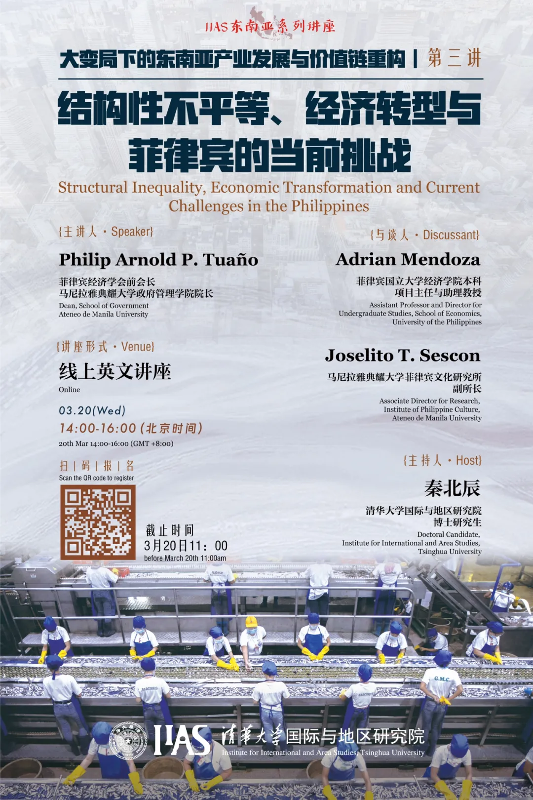 On the afternoon of March 20, 2024, the Institute for International and Area Studies of Tsinghua University invited Professor Philip Arnold P. Tuaño, former president of the Philippine Economics Association and dean of the School of Government at Ateneo de Manila University, to give the third online lecture in the series of lectures on "Industrial Development and Value Chain Reconstruction in Southeast Asia under Great Changes", with the theme of "Structural Inequality, Economic Transformation and Current Challenges in the Philippines". The lecture was hosted by Qin Beichen, a doctoral student at the Institute for International and Area Studies of Tsinghua University, and discussed with Fernando Aldaba, former dean of the School of Social Sciences and professor of economics at Ateneo de Manila University, and Joselito T. Sescon, deputy director of the Institute of Philippine Culture. Nearly 100 teachers and students from domestic and foreign universities and professionals interested in the topic attended the lecture.