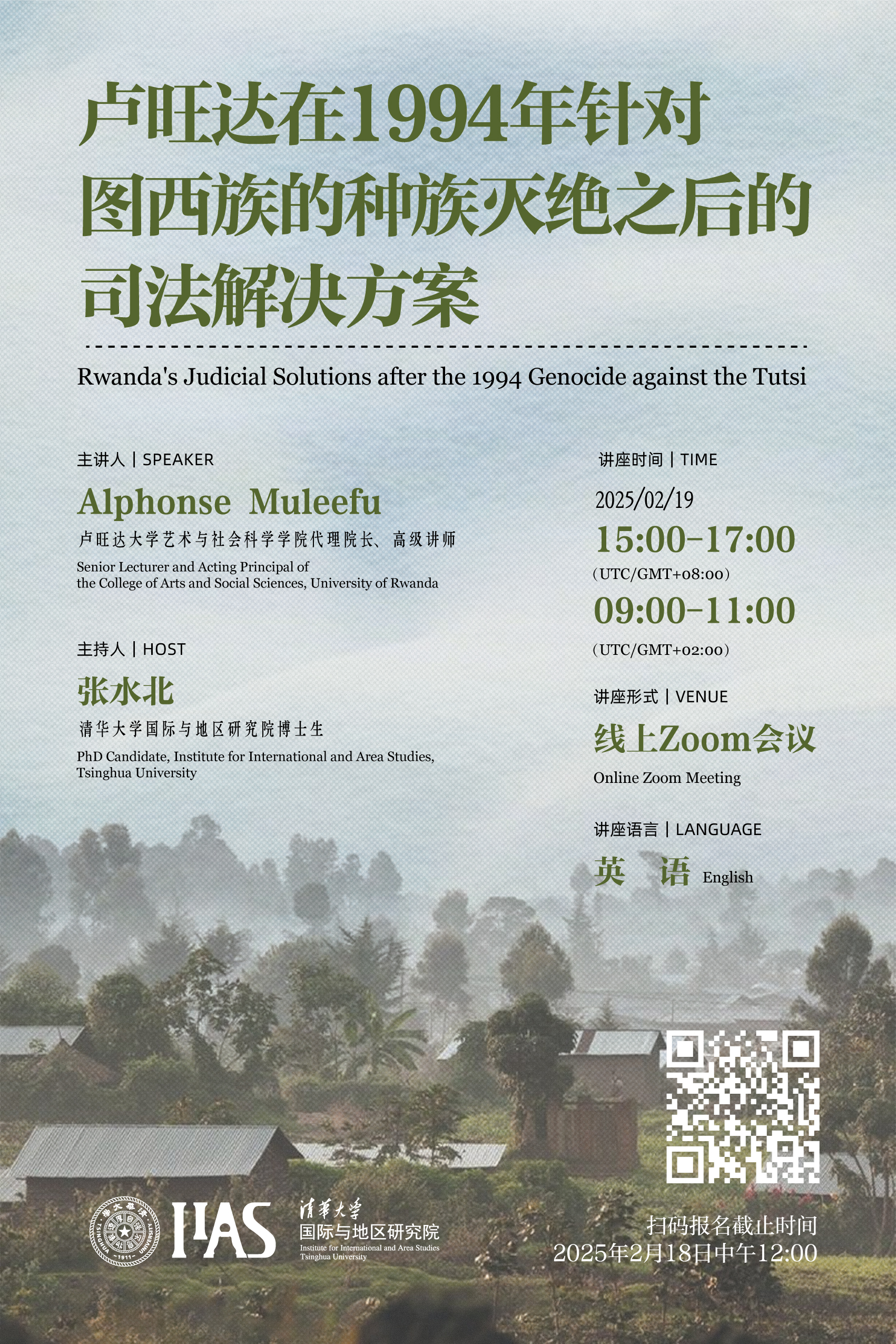 On February 19, 2025, from 15:00 am to 17:00, Center for Sub-Saharan African Studies of the Institute for International and Area Studies (IIAS) at Tsinghua University hosted the first lecture of the 2024-2025 spring semester “Rwanda's Judicial Solutions after the 1994 Genocide against the Tutsi”. The lecture was held both online and offline and was delivered by Dr. Alphonse Muleefu, Senior Lecturer and Acting Principal of the College of Arts and Social Sciences, University of Rwanda. The event was moderated by Ms. Zhang Shuibei, a PhD Candidate at the Institute for International and Area Studies, Tsinghua University.