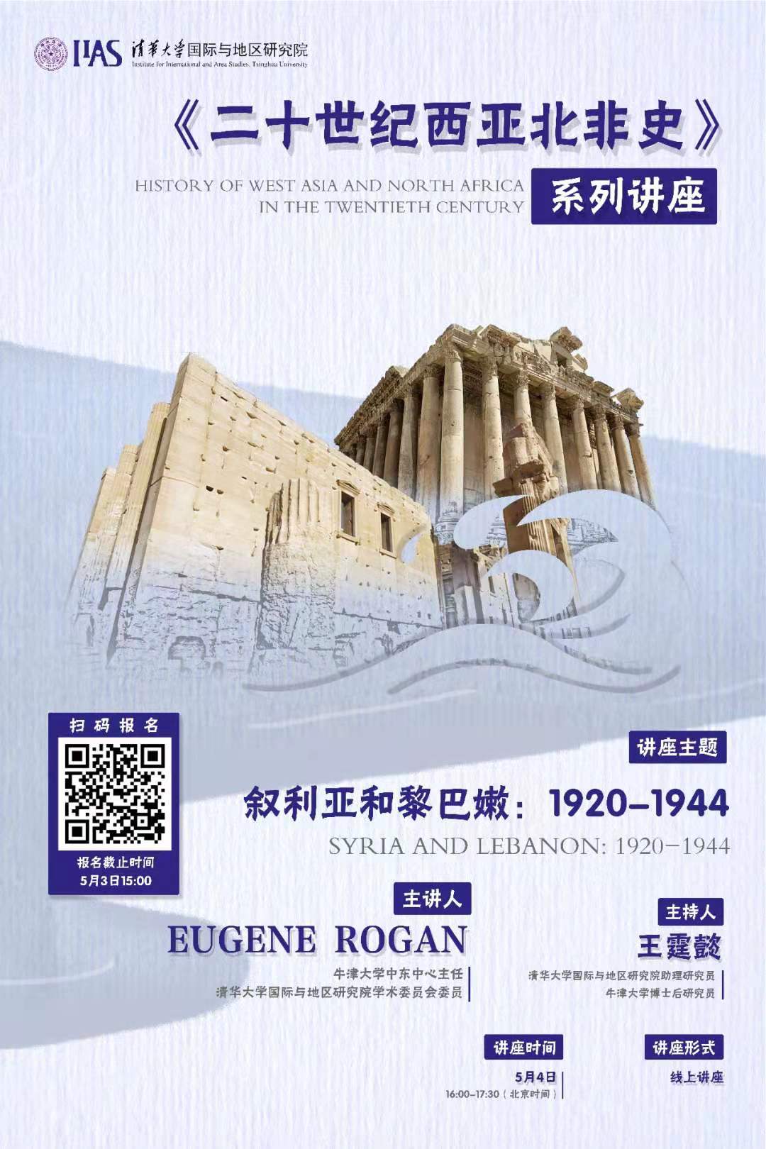 • 2021年5月4日下午,av平台 学术委员会委员、牛津大学中东史教授尤金·罗根在线上为av平台 和国内外知名高校师生带来了“二十世纪西亚北非史”系列讲座的第五讲,主题为:“叙利亚和黎巴嫩:1920-1944”, av平台 助理研究员王霆懿主持了讲座。
