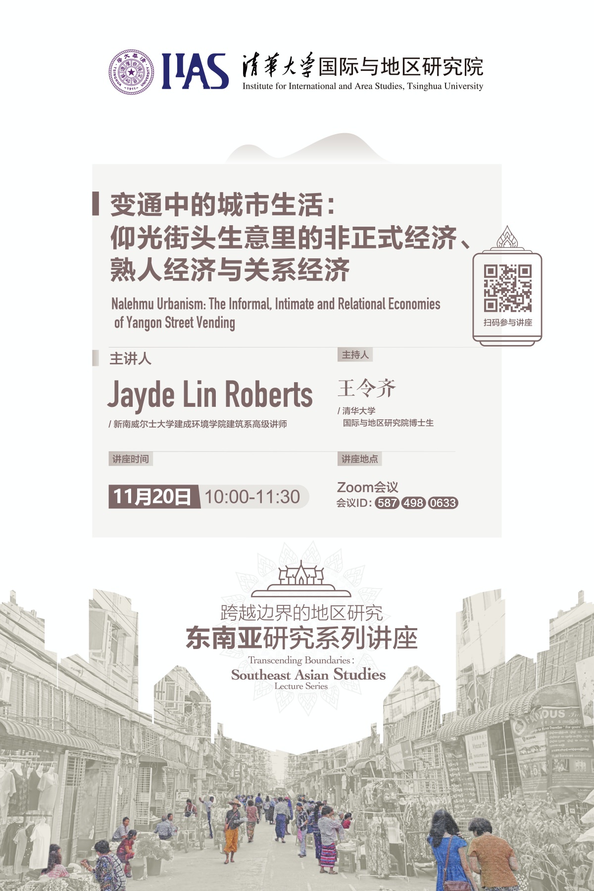 主办的“跨越边界的地区研究:东南亚研究系列讲座”第六讲如期举行。新南威尔士大学建成环境学院高级讲师 Jayde Lin Roberts 博士以线上会议的方式介绍了题为“变通中的城市生活:仰光街头生意里的非正式经济、熟人经济与关系经济”的研究。包括地区院师生在内的约80名听众一道参与了本场讲座。