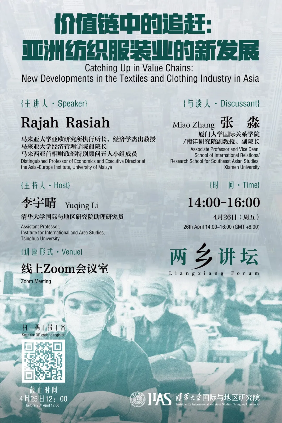 “两乡讲坛”第二十六讲线上开讲,主题为“价值链中的追赶:亚洲纺织服装业的新发展”(Catching Up in Value Chains: New Developments in the Textiles and Clothing Industry in Asia)。本场讲座由马来亚大学亚欧研究所执行所长、经济学杰出教授,经济管理学院前院长,马来西亚首相财政部特别顾问五人小组成员Rajah Rasiah主讲,厦门大学国际关系学院/南洋研究院副院长张淼与谈,av平台